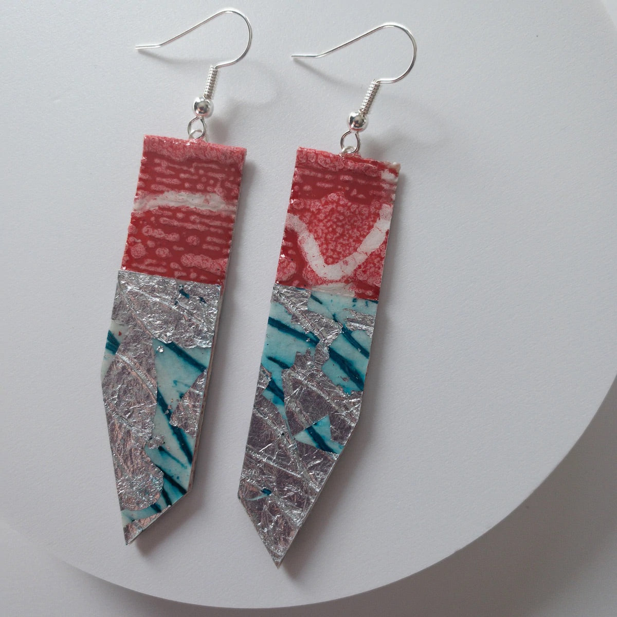 Edythe batik textile earrings in poppy/silver/aqua by Rohlu