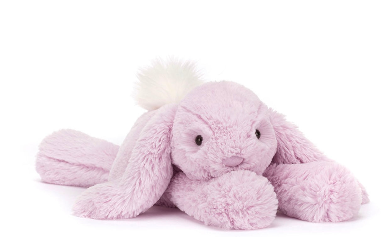 Smudge Lavender Rabbit is the perfect pastel pal. Scrumptiously soft in lavender fur with a fluffy cream bobtail, this lop-eared bunny has trumpet legs and a soft tum for the most luxurious of cuddles. This little rabbit is a loving companion, and the perfect gift for all ages.
