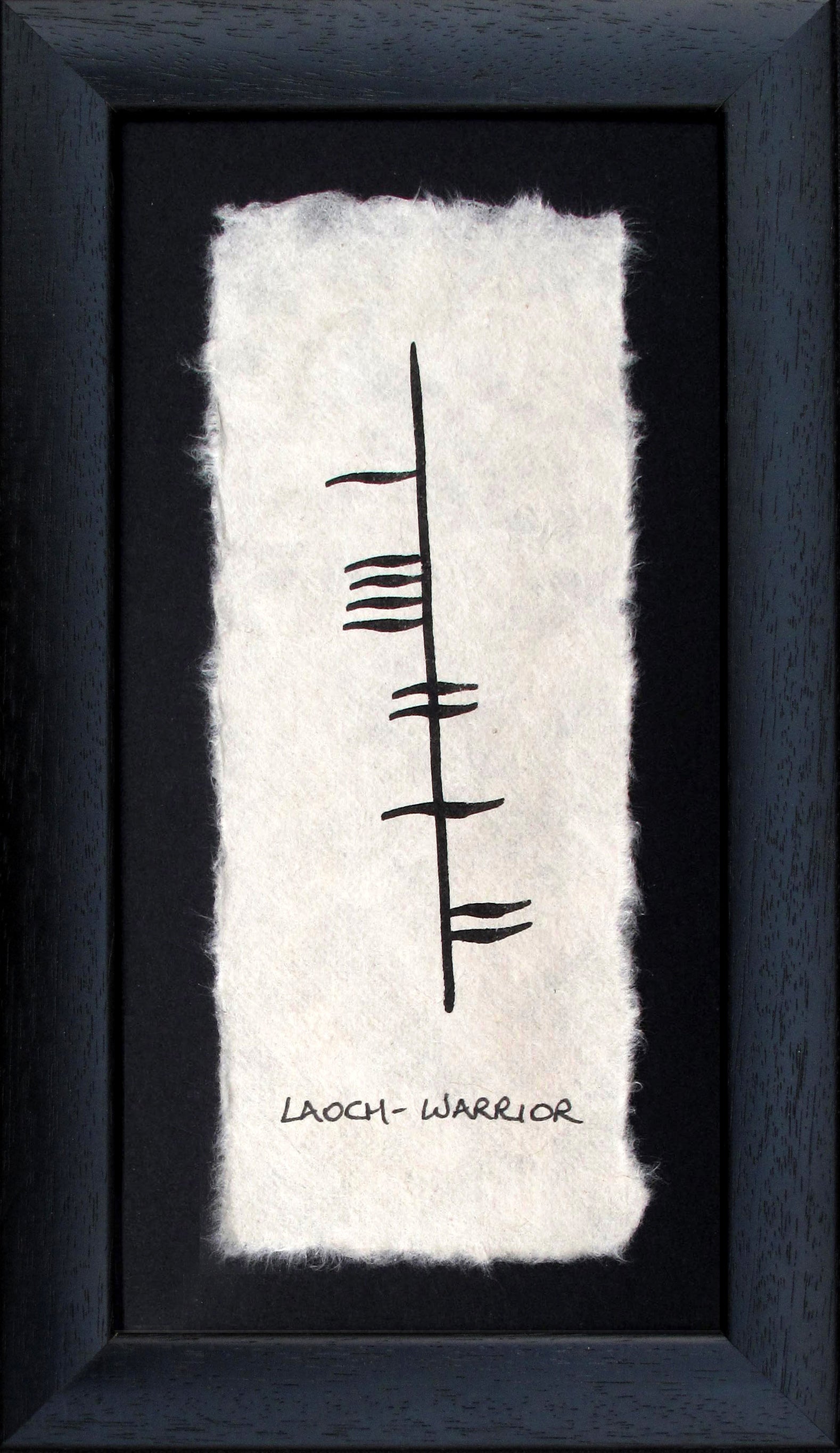 The word Warrior is handpainted in ancient ogham , by Ethel Kelly on handmade paper in her studio in Co Roscommon,